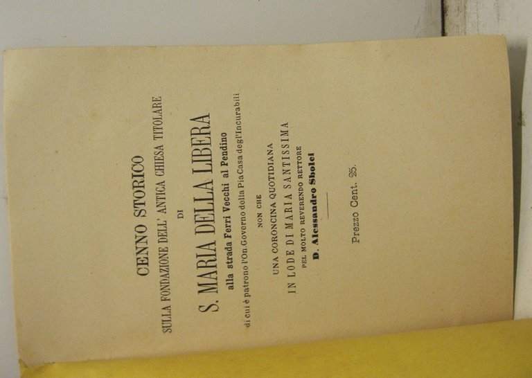 Cenno storico sulla fondazione dell'antica chiesa titolare di S. Maria Della Libera alla strada Ferri Vecchi al pendino di cui e' patrono l'on. governo della Pia casa degl'incurabili. | Libri antichi e moderni | Sbolei Alessandro