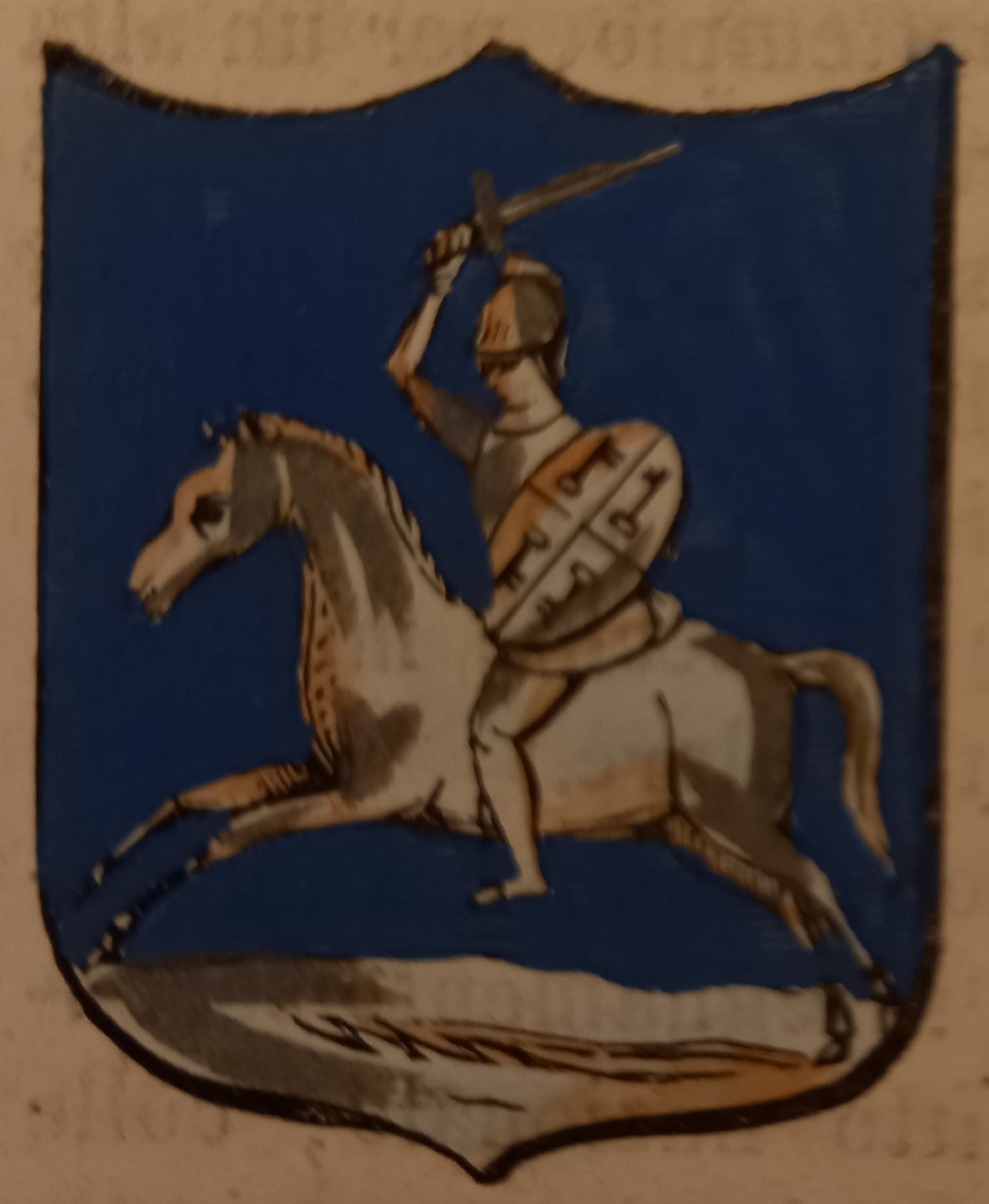 Piccolo stemma comunale colorato a mano d’epoca (cm. 3,8 x 3,2 ca.). Stralcio dal Dizionario Corografico illustrato dell’Italia, edito a Milano nel 1868. Ogni stemma di questa raccolta è inserito in una o più pagine di testo con la descrizione della località, notizie storico - geografiche e statistiche (numero degli abitanti e degli elettori, guarnigioni della Guardia Nazionale, ecc.). Spesso il testo è redatto da studiosi locali o dai sindaci, con maggiori, interessanti notizie.