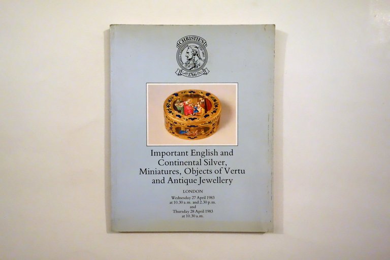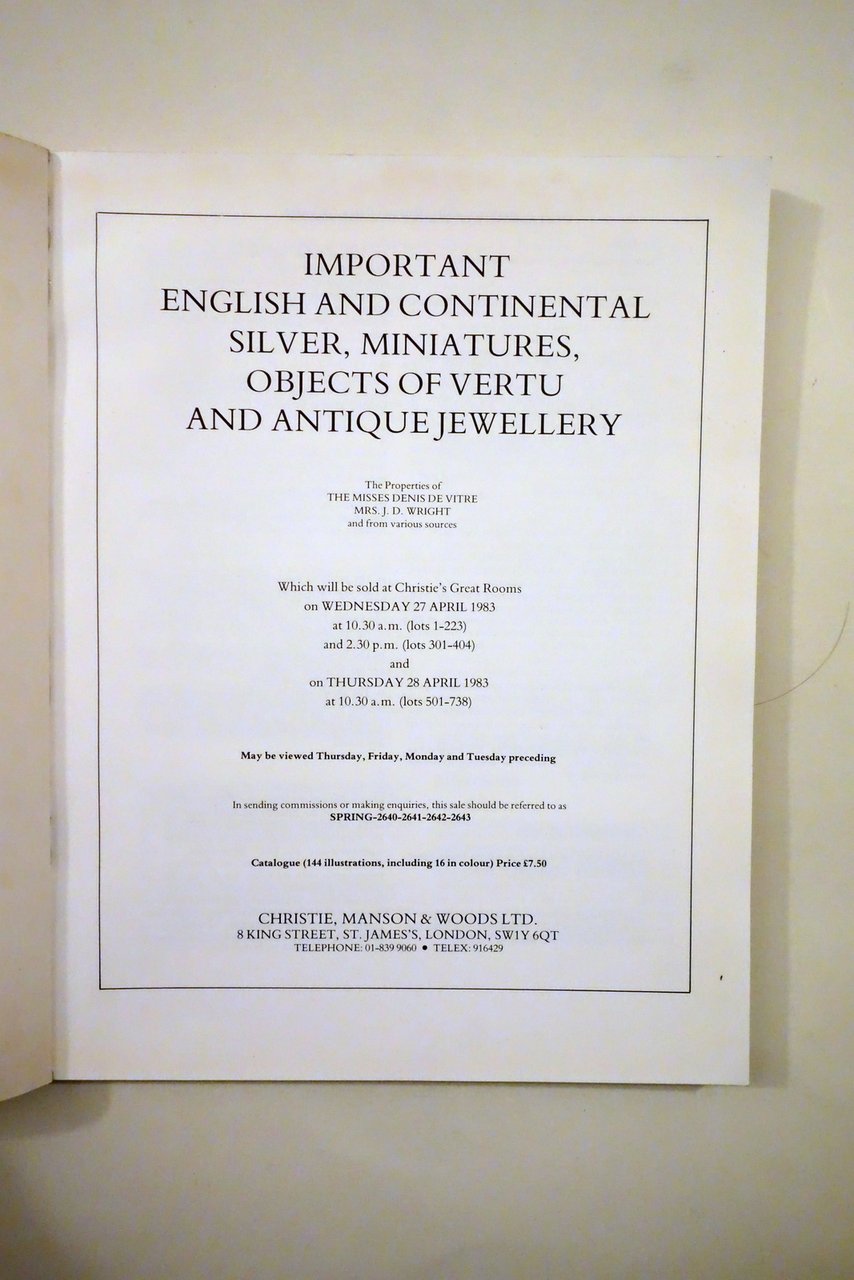 Catalogo d'asta, Christie's - Important english and continental silver, miniatures, objects of vertu and antiques jewellery the properties of the Misses Denis de Vitre, Mrs. J. D. Wright and from various sources London, 27/4/1983 Christie's, London 1983; cm 25,5x20; pp. 150 con ill. in b/n e a colori; brossura ed. Edizione inglese. Condizioni di conservazione Buone condizioni con tracce d'uso, coperta con qualche minimo leggerissimo accenno di sporco. Pagine 144-145 con un minimo segnetto a penna rossa, peraltro interni ottimi. SETT222.L25173 N