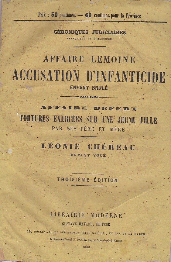 Chroniques judiciaires françaises et étrangères. Affaire Lemoine. Accusation d'omicide. Enfant brulé - Affaire Defert. Tortures exercées sur une jeune fille par ses père et mère - Léonie Chéreau. Enfant volé