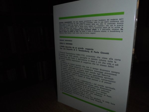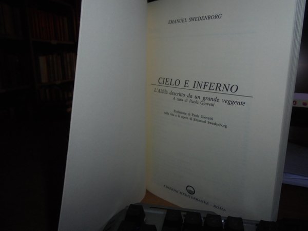 EMANUEL SWEDENBORG. Roma, Edizioni Mediterranee, 1988. CIELO E INFERNO l' Aldilà descritto da un grande Veggente con una bibliografia di E. Swedenborg di Paola Giovetti. In-8°, br. 214, (2) pp. Come nuovo. Uff. stanzetta mob. a sinistra centro sotto