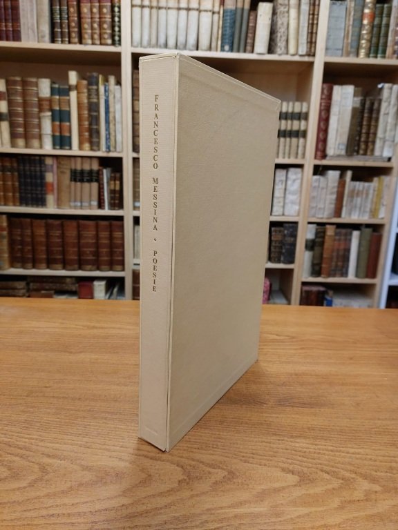 In-4° (cm. 33), pp. 71 [17] in barbe, stampate in caratteri Caslon. Esemplare tra i primi cento contenente 1 litografia originale firmata da Francesco Messina in antiporta (n.67). Legatura in brossura editoriale ocra a risvolti (protetta da velina) con titolo al piatto anteriore e al dorso, camicia e astuccio in cartonato crema. Ottimo esemplare allo stato di nuovo.
