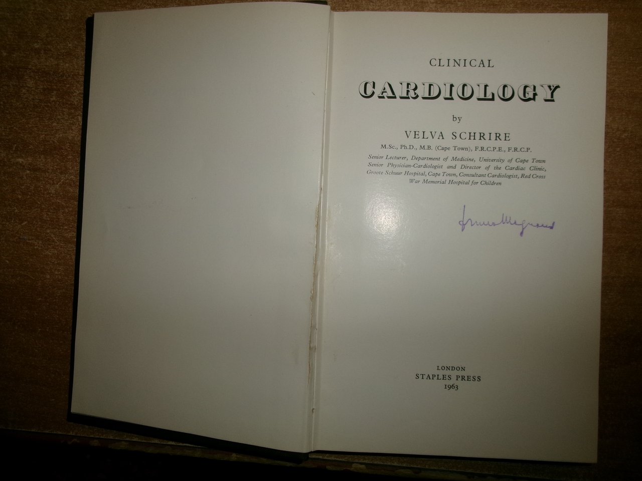 CLINICAL CARDIOLOGY - VELVA SCHRIRE. London, Staples Press, 1963. In-8°, tela edit. con titolo al dorso. 391 pp. con numerose figure in nero n.t. Ottimo stato (non presente sovracopertina) con firma del Prof. Dott. Bruno Magnani. Testo in inglese. Uff. C - III - 6