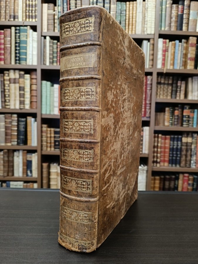 In-folio (cm. 36,3), legatura coeva in piena pelle con titolo e fregi al dorso (lievissimi segni d'usura), tagli rossi, antica nota alla controguardia; pp. XX 1124 [80] in buono stato, con titolo in rosso e nero (leggerissima brunitura e lievi fioriture). Dedicatoria a Carlo Emanuele I. Ampissimi indici su due colonne in fine. Accurata e bella edizione ginevrina dell'imponente lavoro giuridico del Fabro, stampato per la prima volta a Lione nel 1610, e costituente una monumentale e ordinata collezione delle decisioni del senato di Chambéry, ordinate secondo il sistema del codice di Giustiniano e ampiamente commentate. Antoine Favre fu il primo Presidente del Senato di Savoia, governatore della Savoia e fondatore ad Annecy nel 1606. Esemplare molto buono. (NP5)