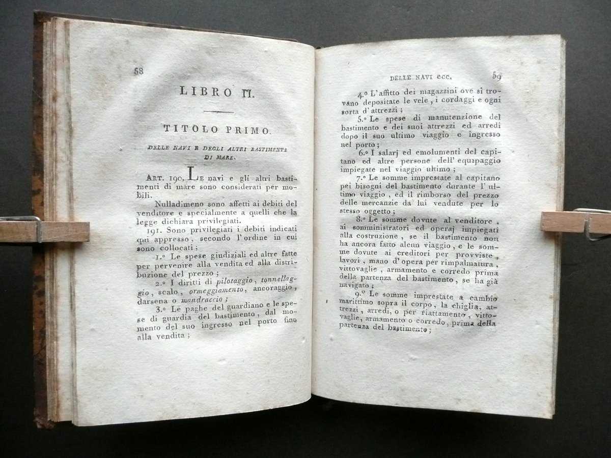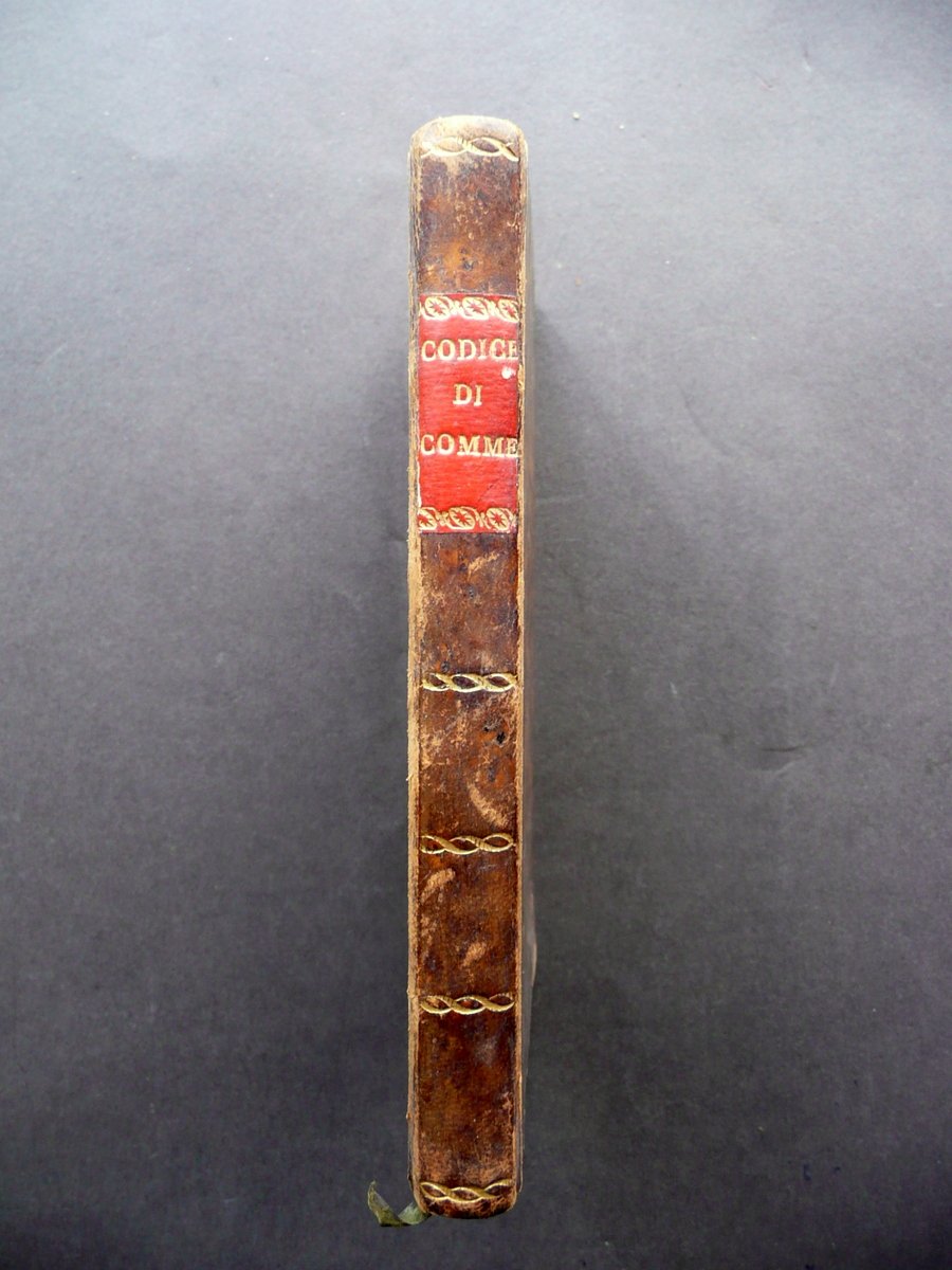 Codice di Commercio di terra e di mare pel Regno d'Italia Dalla Stamperia Reale, Milano 1808; cm 14x9,5; pp. 214; legatura d'epoca in mezza pelle con titolo e fregi in oro al dorso (titolo entro tassello); piatti marmorizzati; tagli colorati a spruzzo. Condizioni di conservazione Esemplare ben conservato con tracce d'uso e del tempo, coperta con alcune piccole leggere abrasioni, pochi minuscoli aloni al piatto ant. Interni buoni con alcune leggere bruniture. Interessante codice di commercio di piena età napoleonica. SETT131.L13124 N P