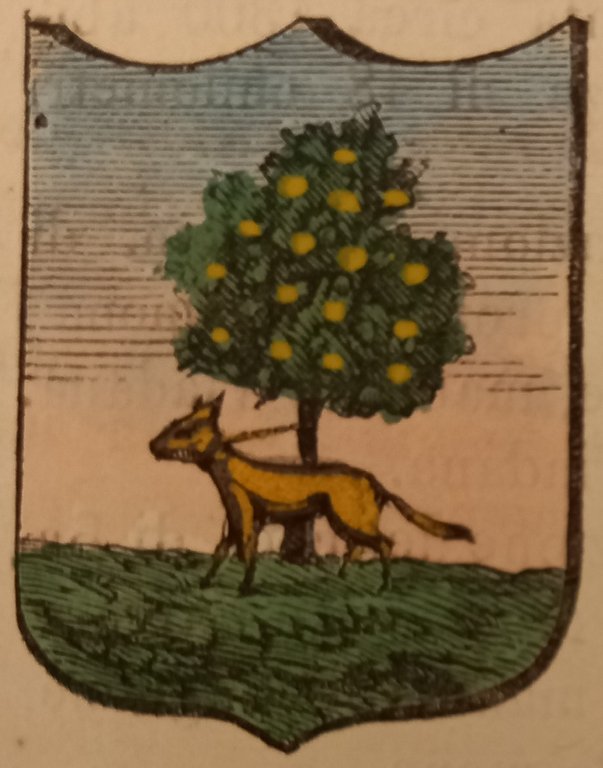 Piccolo stemma comunale colorato a mano d’epoca (cm. 3,8 x 3,2 ca.). Stralcio dal Dizionario Corografico illustrato dell’Italia, edito a Milano nel 1868. Ogni stemma di questa raccolta è inserito in una o più pagine di testo con la descrizione della località, notizie storico - geografiche e statistiche (numero degli abitanti e degli elettori, guarnigioni della Guardia Nazionale, ecc.). Spesso il testo è redatto da studiosi locali o dai sindaci, con maggiori, interessanti notizie.