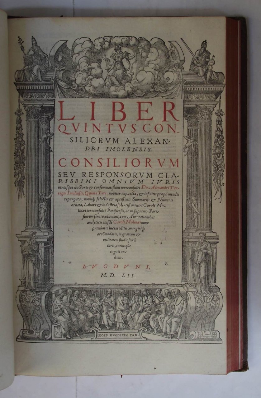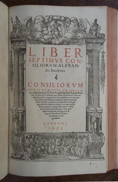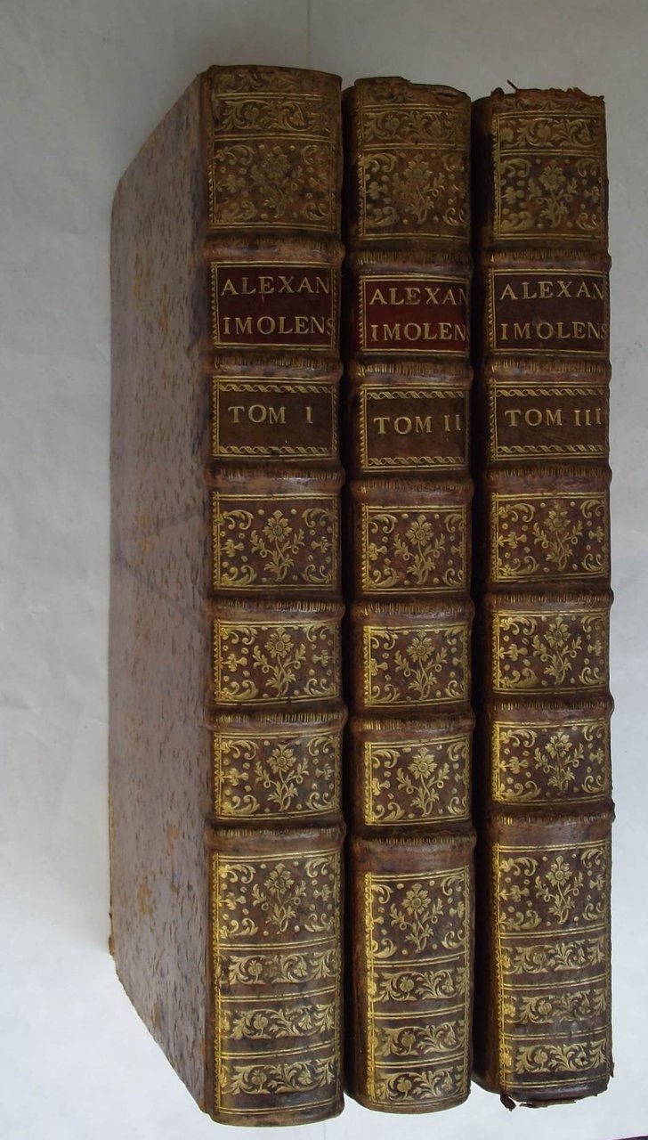 Sette parti legate in tre volumi in-folio (cm. 41), cc. 202; 105; 85 (1); 89 (1); 134; 167 (1); 124. Con sei stupendi frontespizi in rosso e nero inquadrati entro cornice xilografica (il secondo volume non deve possederlo), molti capilettera ornati e testo in semi-gotico. Solida legatura settecentesca in piena pelle, dorsi a nervi con ricchi fregi e titoli in oro. Bell’esemplare, fresco, genuino ed in eccellente stato di conservazione. Verosimilmente apparve un ottavo volume di indici qui non presente. Alessandro da Imola (1424-1477), commentatore di grandissima fama ed allievo di Paolo di Castro, insegnò a Pavia, Bologna, Ferrara e Padova; figura completa per la versatilità ed originalità della dottrina, Tartagni commentò infatti il corpus giustinianeo e le Decretali di Gregorio IX e compilò inoltre una monumentale serie di consilia che lo portarono ad essere considerato giureconsulto di primissimo livello nel panorama quattrocentesco europeo. Raro.