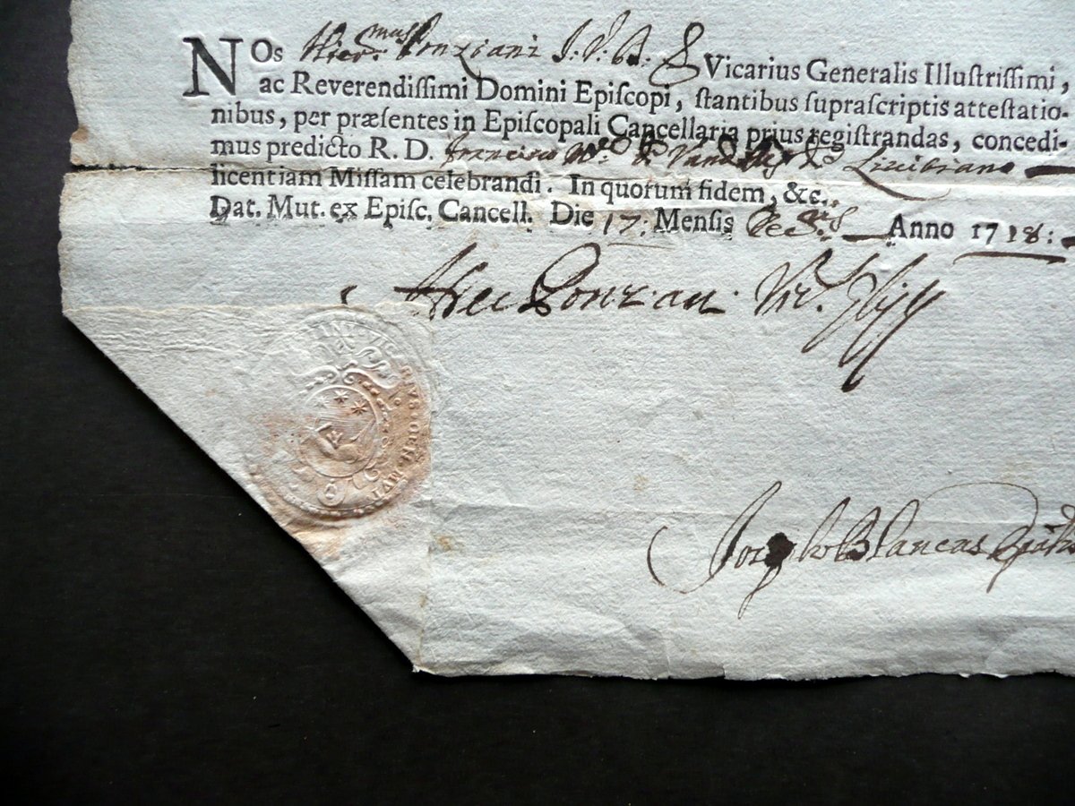 Concessione Licenza Celebrazione Messa 1719 Vescovo Ponziani Vandelli Firme