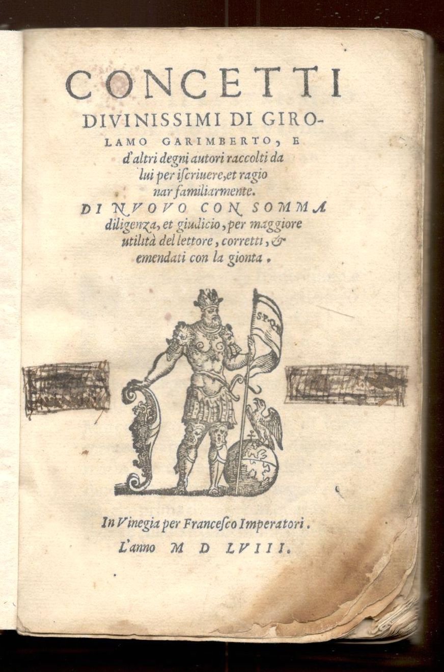 Concetti Divinissimi di Girolamo Garimberto, e d'altri degni autori raccolti da lui per iscrivere, et ragionar familiarmente. Di nuovo con somma diligenza, et giudicio, per maggiore utilità del lettore, corretti, & emedati con la gionta | Libri antichi e moderni | Garimberto, Girolamo