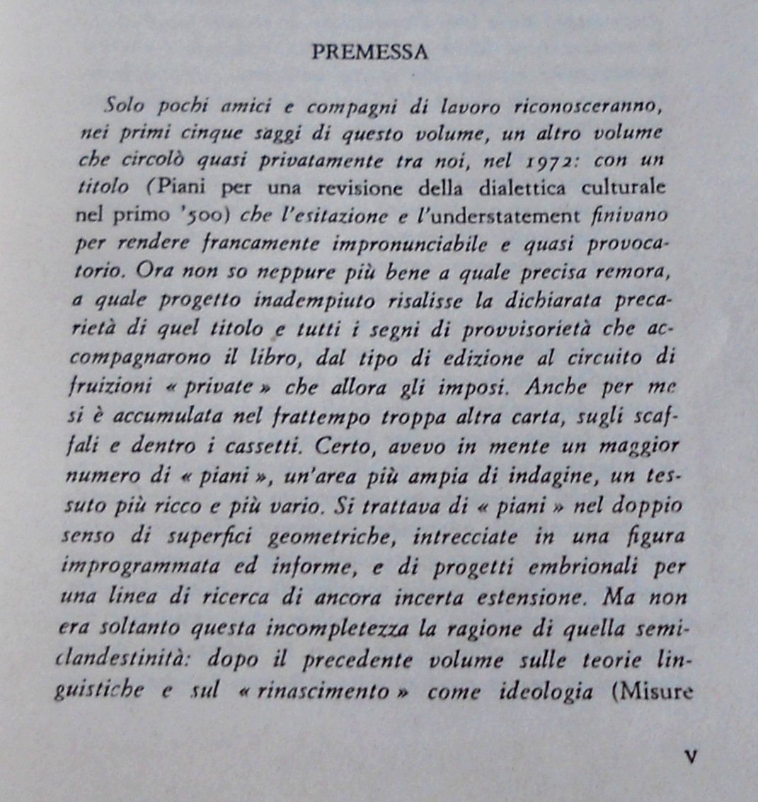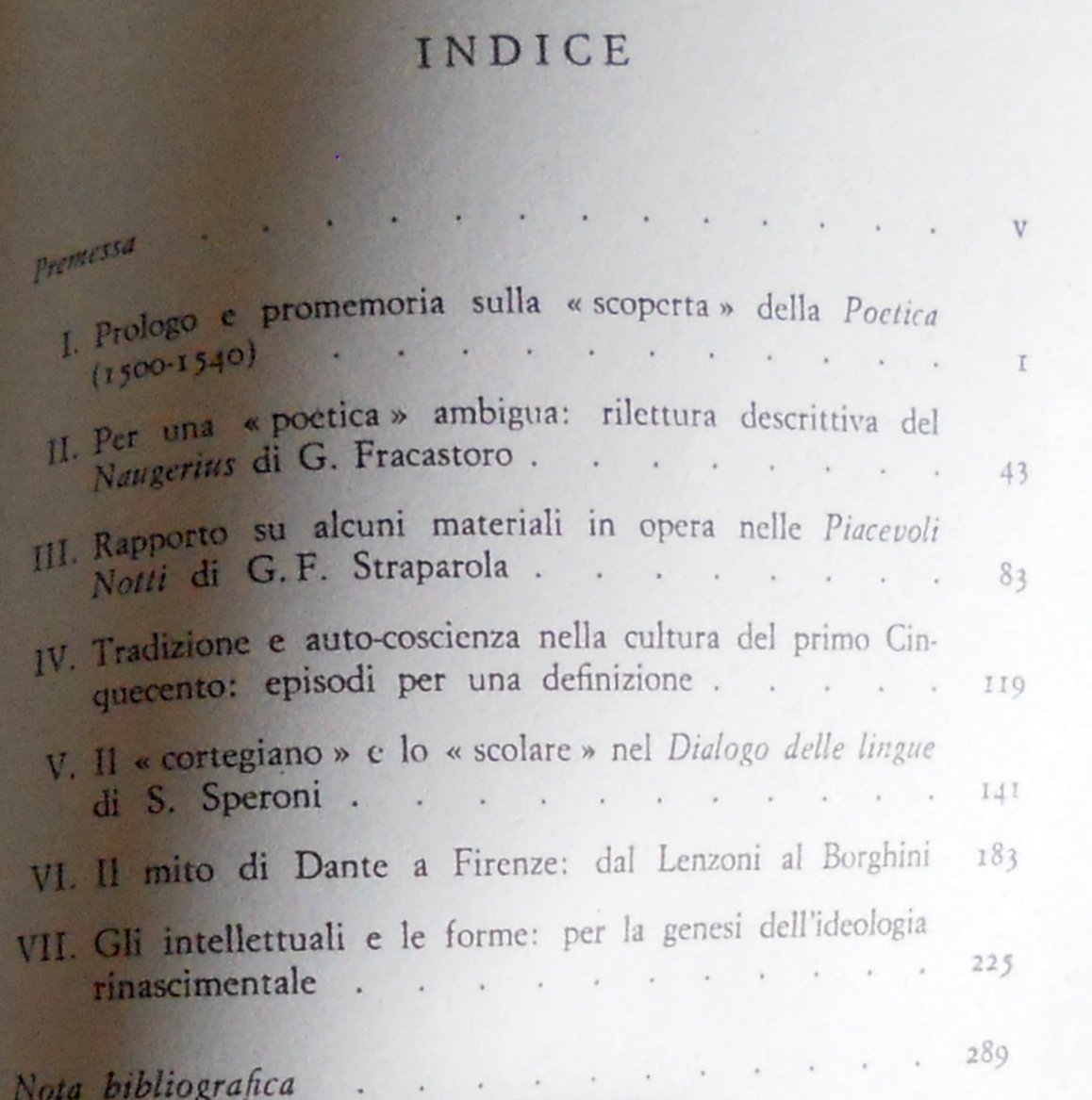 Soggetti: Studi culturali letterari, Storia letteraria Critica, Cinquecento, Rinascimento, Umanesimo, '500, Classicismo, Umanisti, Cultura rinascimentale, Quattrocento, '400, Romanzieri, Novellieri, Novelle, Frattura, Intellettuali, Dialettica culturale, Ideologie, Saggi, Poetica, Naugerius, Girolamo Fracastoro, Giovanni Francesco Straparola, Piacevoli notti, Tradizione, Cortegiano, Speroni, Dialogo delle lingue, Dante Alighieri, Mito, Firenze, Carlo Lenzoni, Vincenzo Borghini, Forme, Stili letterari, Libri rari Vintage fuori catalogo, Collezionismo, Canzoniere, Petrarca, Modelli, Influenze, Mecenatismo, Farnese, famiglia De Medici, Filosofia, Scienza, De morbo gallico, Margherita di Valois, Giulio II, In difesa della lingua fiorentina, Pietro Bembo, Filologia, Formalismo, Angelo Poliziano, Gelli, Poesia, Gusto, Accademia Fiorentina, Epistola a Cangrande, Esegesi dantesca, Marsilio Ficino, Naugerius sive de poetica, Opere filosofiche, Turrius sive de intellectione, Fracastorius sive de anima, Intelletto, Anima, Predestinazione, Prosa, Dibattiti, Fiorentinità, Teorie letterarie, Tomitano, P.F. Giambullari, Navagero, Aristotele, Platone, Dialettica, Retorica, Corte, Cortigiani, Boiardo, Aldo Manuzio, Antichi Archetipi Asolani Autonomia bembesca Brocardo Castiglione Classicismo Cortegiano Cortigiana Crisi Decameron Ercole Strozzi Forme Giraldi Governo ideale Jacopo Sadoleto latino Lazzaro Bonamici Lettere Linguistica Lirica Logica Mito Municipale Natura Pedagogia Polemica Pomponazzi Potere Produzione Prose Scrittura Storiografia Torquato Tasso tecniche Tensioni Toscana Trissino Urbino Venezia Volgare Literary cultural studies History criticism Sixteenth century Renaissance Humanism Classicism Humanists Culture Novelists Short storytellers stories Fracture Intellectuals Cultural dialectics Ideologies Essays Poetics Pleasant Nights Tradition Courtesan Dialogue of languages Myth Florence Forms Literary styles Rare books out of print Collectibles Petrarch Models Influences Patronage De Medici family Philosophy Science Julius II In defense of the Florentine language Philology Formalism Taste Florentine Academy Epistles Dante's exegesis Philosophical works, Turrius sive de intellectione, Intellect Soul Predestination Prose Debates Fiorentinity Literary theories Aristotle Plato Dialectics Rhetoric Court Courtiers Ancient Archetypes Autonomy Classicism Crisis Forms Ideal Government Letters Linguistics Lyric Logic Municipal Myth Nature Pedagogy Polemics Power Production Prose Writing Historiography techniques Tensions Tuscany Venice Vulgar