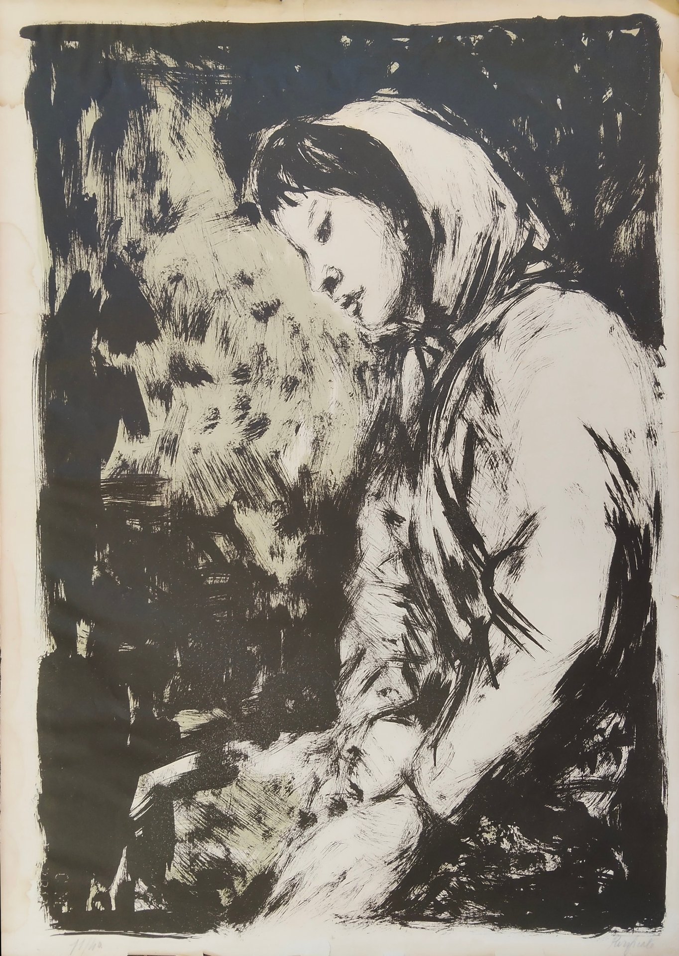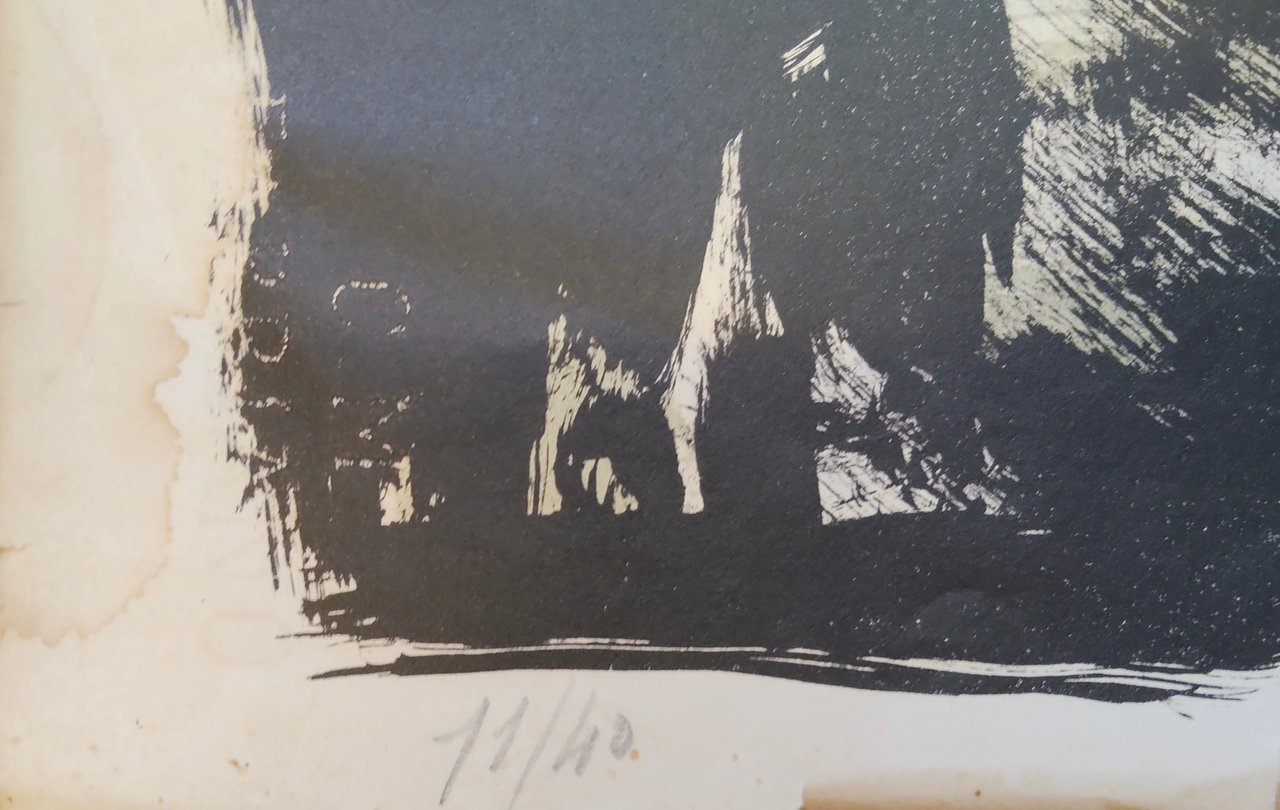 Timbro a secco della Galleria "Il Torchio" e della Libreria "Prandi". Tiratura 11/40. litografia a due colori cm. 51 x 71 Buono (Good) Buon es., strappi ai margini e gore sparse, sul retro scheda scritta a matita.