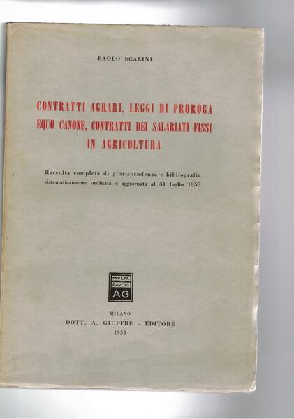 Contratti agrari, leggi di proroga equo camone, contratti dei salariati fisii in agricoltura. Raccolta completa di giurisprudenza e bibliografia, sistematica ordinata e aggiornata al 31 lug. 1958. | Libri antichi e moderni | Scalini Paolo.