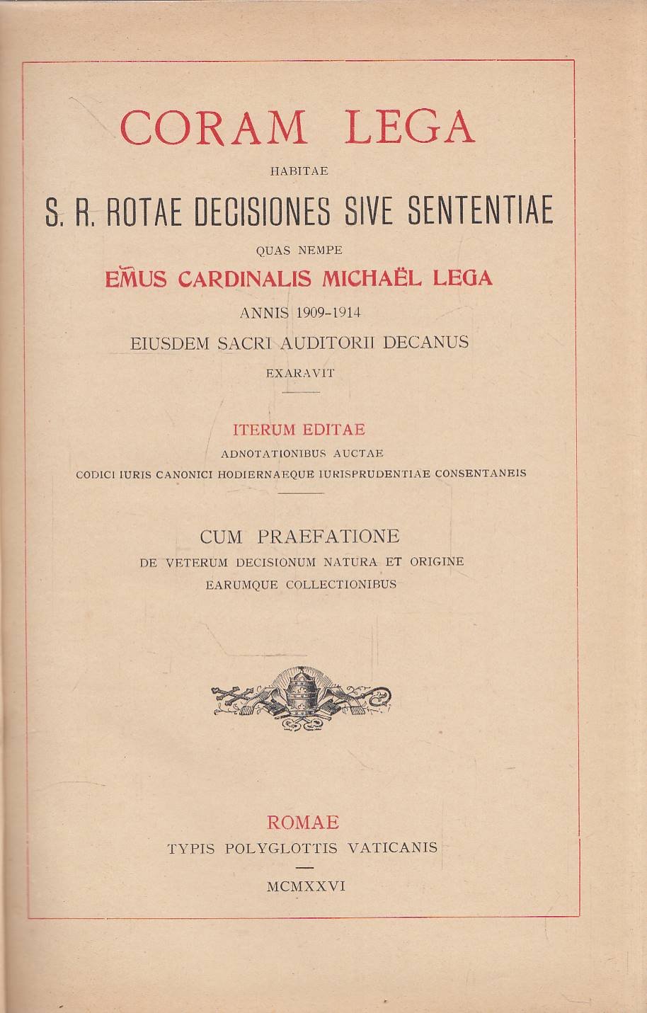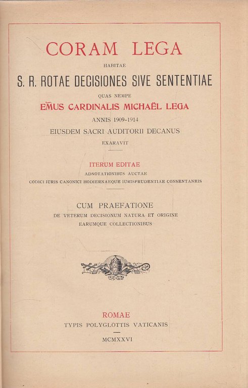 Coram Lega Habitae S. R. Rotae Decisiones Sive Sententiae. Annis 1909-1914 | Libri antichi e moderni | Emus Cardinalis Michaël Lega