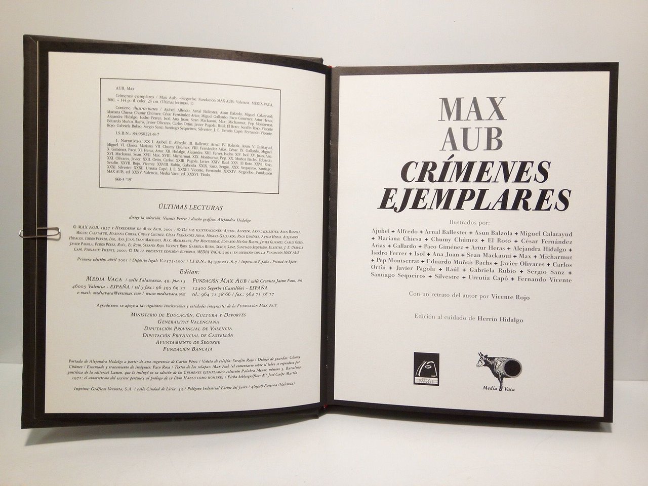 Crímenes Ejemplares / Ilustrados por: Ajubel, Alfredo, Arnal Ballester, Asun Balzola, Miguel Calatayud, Mariana Chiesa, Chumy Chúmez, El Rotó, César Fernández Arias, Gallardo, Paco Giménez, Artur Heras, Alejandra Hidalgo, Isidro Ferrer, Isol, Ana Juan, Sean Mackaoui, Max, Micharmut, Pep Montserrat, Eduardo Muñoz Bachs, Javier Olivares, Carlos Ortin, Javier Pagola, Raúl, Gabriela Rubio, Sergio Sanz, Santiago Sequeiros, Silvestre, Urrutia Capó, Fernando Vicente; Con un retrato del autor (al final) por Vicente Rojo; Edición al cuidado de Herrín Hidalgo