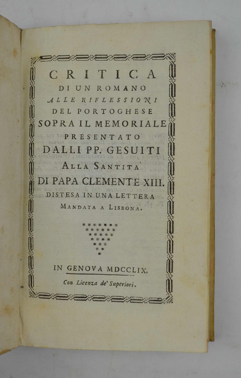 Critica di un romano alle riflessioni del portoghese sopra il memoriale presentato dalli PP. Gesuiti alla Santità di Papa Clemente XIII. distesa in una lettera mandata a Lisbona. | Libri antichi e moderni |