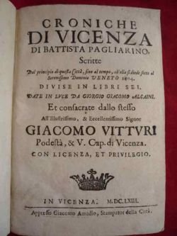 Croniche di Vicenza [.] scritte dal principio di questa città, sino al tempo, ch'ella si diede sotto al Serenissimo Dominio Verneto1404. Divise in libri sei. Date in luce da Giorgio Giacomo Alcaini [.]. | Libri antichi e moderni | Pagliarino Battista.