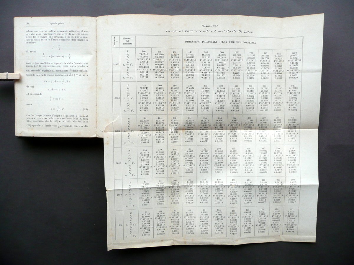 Ing. C. Ferrario, Curve graduate e Raccordi a curve graduate Con speciale riferimento alle pratiche importanti e nuove applicazioni nei tracciamenti ferroviari (25 tavole e 41 figure) In continuazione al Manuale Curve circolari e raccordi a curve circolari" dello stesso autore Hoepli, Milano 1905, cm 15x10,5, pp. XX; 252, con 41 fig. in b/n nel t. e 25 tavole (=tabelle) in b/n fuori t. e su due pagine (una è rip. più volte); tutta tela ed. con titolo al dorso e al piatto ant.; tagli rossi. Margine sup. del risguardo ant. con nome del precedente proprietario annotato a penna. Condizioni di conservazione Esemplare ben conservato con tracce d'uso, coperta con qualche minima traccia di sporco. Interni buoni con qualche piccola lieve brunitura principalmente ai risguardi; un margine della tabella rip. più volte con un piccolo strappetto e una leggera pieghetta. Prima edizione (1905). SETT114.L10888 N P "