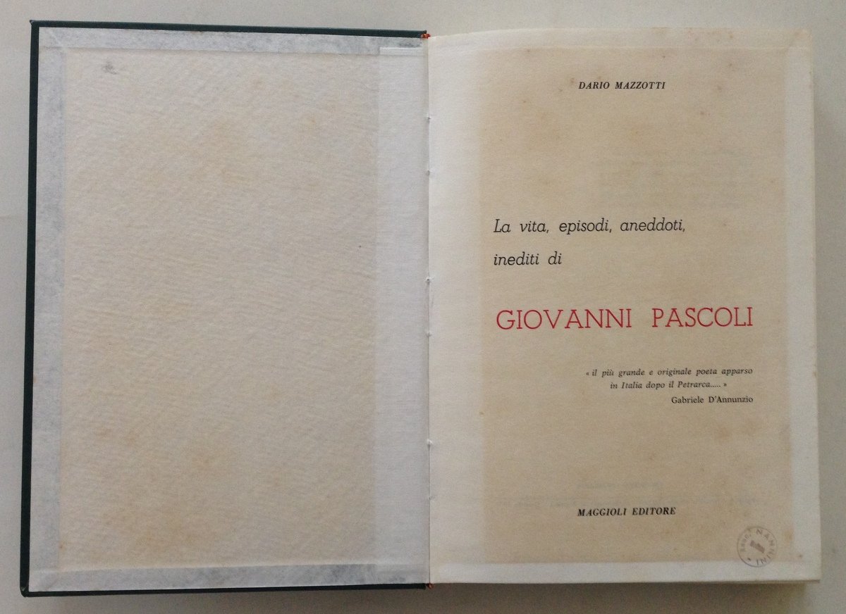 Dario Mazzotti, La vita, episodi, aneddoti, inediti di Giovanni Pascoli Maggioli Editore, 1970, cm. 24.5x17.5; pp. 370; ill. fot. in b/n f.t. e a p.pag.; timbro ex proprietà al frontespizio cart. ed. t. pelle con titoli al piatto anteriore e al dorso. Condizioni di conservazione Esemplare in buono stato con leggere tracce d'uso; piatti e dorso con leggerissime abrasioni; titoli del dorso leggermente sbiaditi; interni buoni, le prime e le ultime pagine leggermente ingiallite. SETT130.L13029 MT