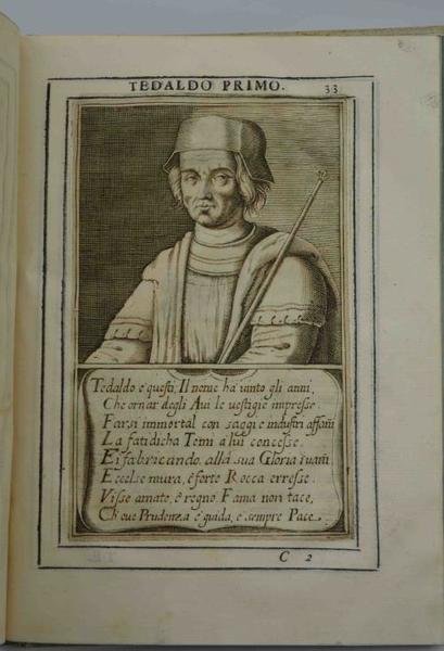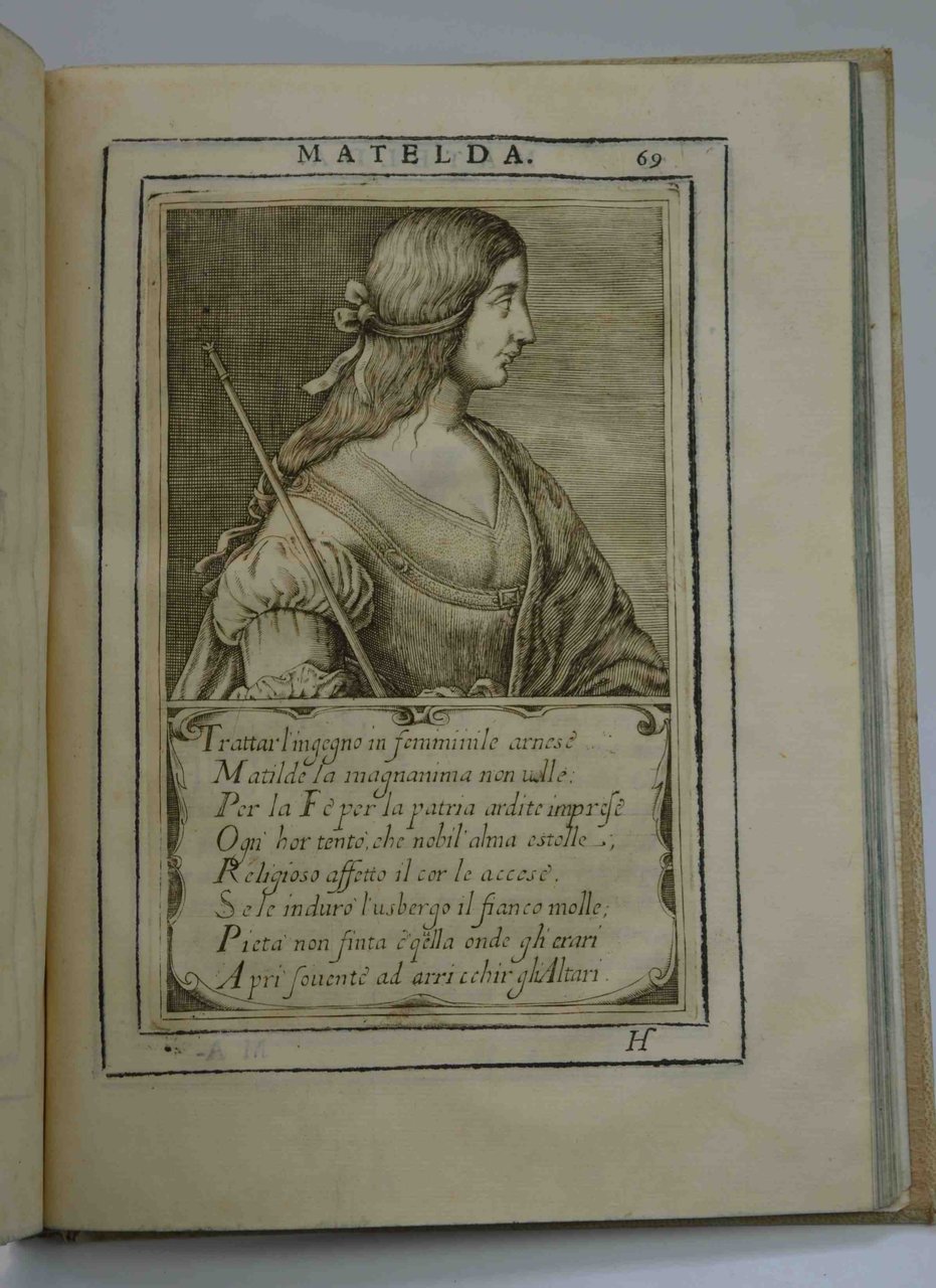 Cm. 25,5 pp. (8) 124 Testo inquadrato da duplice filetto. Bel frontespizio figurato e 5 ritratti a mezzo busto con nella parte inferiore epitaffio. Il tutto finemente inciso in rame. Capolettera e testate xilografici. Leg. piena pergamena (antica?) rimontata. Qualche strappetto abilmente ricongiunto, peraltro esemplare ben conservato. Le biografie presenti sono di: Almerico, Tebaldo I, Bonifacio III, Matilde, Azzo VIII. Era intendimento dell'Autore di pubblicare 24 biografie, ma non portò a compimento il lavoro, dando alle stampe le presenti 5 biografie, in questa unica edizione. Cfr. Coleti; Lozzi, 1624: " Raro. Con front. egregiamente fig. e con 5 bei ritratti, tra cui interessantissimo quello della Contessa Matelda."; Piantanida, 756: “Rara opera”.