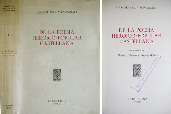 De la Poesía Heróico-Popular Castellana. Estudio precedido de una Oración acerca de la Literatura Española. [1874]. Edición preparada por Martín de Riquer y Joaquín Molas. | Libri antichi e moderni | Milá Y Fontanals, Manuel (1818-1884).