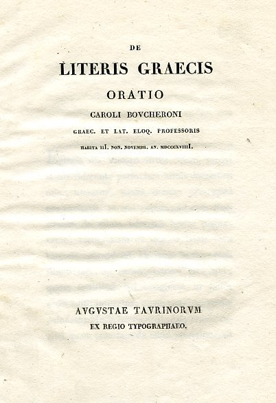 In-4° (276x215mm), pp. (2), 29, (1), cartonatura originale marmorizzata di colore marrone. Intonso e a pieni margini, con qualche usuale fioritura. Edizione originale di questa dissertazione sulla letteratura greca. Il Boucheron (Torino, 1773-ivi, 1838) fu latinista, professore di eloquenza, di storia e di archeologia, nonché autore di eleganti iscrizioni ed orazioni latine.