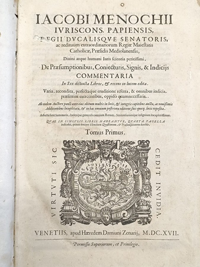 <span style="font-style: normal;">2 volumi in-folio (cm. 36,5), legature coeve in cartonato alla rustica con titolo manoscritto ai dorsi (alcune tracce d'uso, abrasioni ai piatti, stanca al vol. II); pp. [16] 578 [128 di </span><i>Index</i>], [4] 868 in barbe, in buono stato (alcuni fori di tarlo alle prime carte, piccole gore marginali); vignetta allegorica in xilografia ai frontespizi, graziose testatine, capilettera e finalini silografici. Edizione non comune di questa interessante opera del giurista pavese Giacomo Menochio, il quale offre un importante contributo alla giurisprudenza del Ius comune. Antiche firme di possesso ai risguardi. Esemplare più che discreto.