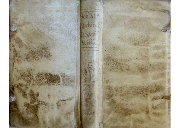Padua: Patavii, ex Typographia Seminarii, apud Joannem Manfrè, 1755. 8vo.; 7 hs., 256 pp., 1 h. Encuadernación de época, en pergamino, con cierres. Nacido en Bolonia y Arzobispo de Bolonia desde 1731, Prospero Lambertini fue elegido Papa en 1740 tras un largo Cónclave que duró seis meses. Benedicto XIV fue indudablemente el más erudito y culto de los Pontífices del Siglo XVIII y promovió a los hombres más doctos de su tiempo: Muratori, Querini y especialmente Rogerio Boscovich (1711-1787) quien le sugeriría en 1757 la histórica retirada del "Índice" de la obra de Galileo "De revolutionibus orbis celestis". Cooperó con Winckelmann en la fundación de la Accademia Archaeologica Romana, favoreciendo nuevas excavaciones, y consiguió detener la degradación del Coliseo, considerado hasta entonces como cantera de piedra. Mantuvo correspondencia con Voltaire, con Federico de Prusia y con Catalina de Rusia, fue destacado bibliófilo y numismático, aumentando los tesoros de la Biblioteca Vaticana.
