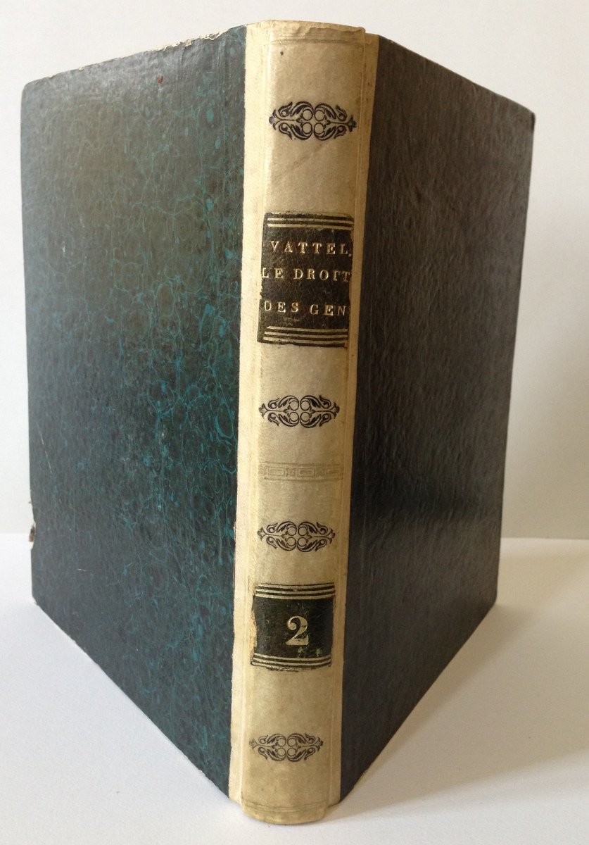 DE VATTEL, LE DROIT DES GENS OU PRINCIPES DE LA LOI NATURELLE NEUCHATEL, SOC. TYPOGRAPHIQUE, 1773, seconda edizione aumentata, solo il II° vol. (manca il I°), in 4° picc., pp. 328, bella leg. m. pergamena coeva con tass., fregi e tit. al dorso, piatti marmor., tagli color. puntegg. Condizioni di conservazione Esemplare in buono stato con leggere tracce d'uso, piccole abrasioni agli angoli e ai margini, interni freschi con qualche brunitura, solo il secondo volume, manca il primo volume. MM0420/B2-349