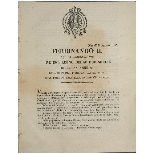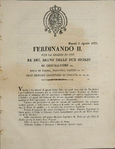 Che potranno chiedersi quando questi saranno resi esecutorj in Sicilia - Decreti dell'8 Agosto 1833 - in 4° - pp.23; 2; 4; 8 - Non rilegato - Stemma borbonico ai frontespizi - Leggera gora alla prima carta