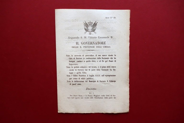 Decreto, Regnando S. M. Vittorio Emanuele II il Governatore delle R. Provincie dell'Emilia "Vista la necessità di provvedere di una nuova strada la Città di Ferrara in continuazione della Nazionale che da Bologna conduce a quella Città, e al Po pel Ponte di Lago-scuro; [.] R. Tipografia Governativa, 1860; decreto a stampa su bifolio in carta; piccolo stemma sabaudo inc. alla parte superiore. Cm 21x16,5. Condizioni di conservazione Molto ben conservato con pressoché trascurabili segni del tempo, qualche minima e poco visibile brunitura. SC03.D19439 N "