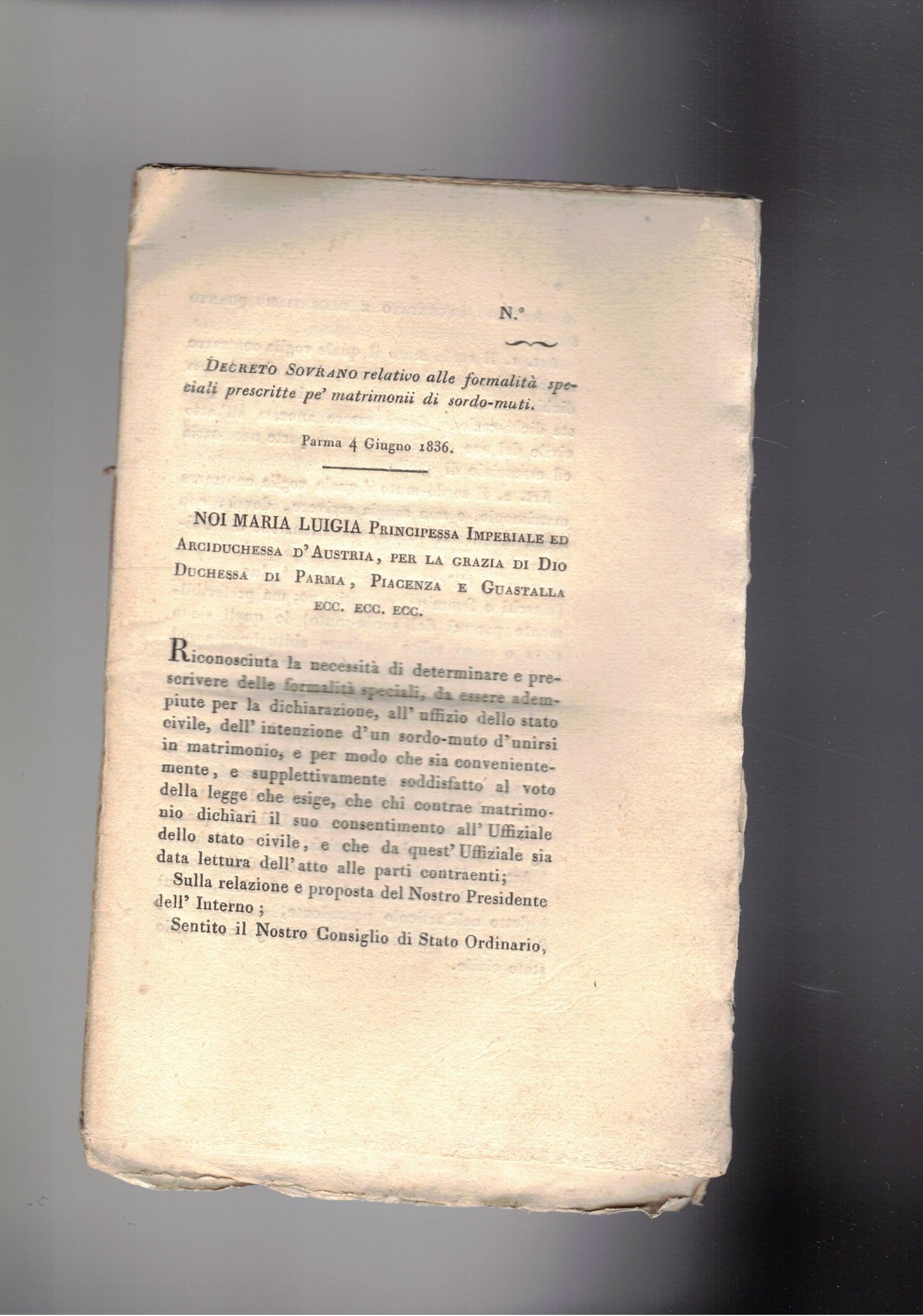 Decreto sovrano relativo alla formalità, speciali prescritte pè matrimoni di sordo-muti. Unito il modello per la dichiarazione fra maggiori di anni 24 e se uno o entrambi i coniugi siano analfabeti. | Libri antichi e moderni | Maria Luigia Principessa Imperiale.