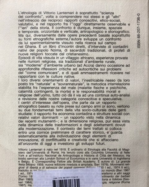 Soggetti: Etnografia, Società, Comunicazione, Sociologia, Antropologia Sociale e culturale, Scienze sociali, Folklore, Dinamica Culturale, Identità, Africa, Nativi, Popoli africani, Ghana, Storia Nzima, Ascianti, Villaggio, Economia, Feste, Lavoro, Famiglia, Parentele, Agricoltura, Contadini, Acculturazione, Religione, Sincretismo, Movimenti sincretici, Water Carriers, Valori, Action Church, Movimento pentecostale, Chiese spirituali, Fabbro africano, Riti di guarigione, Rituali, Accra, Chiesa, Spiritualità, Cristianesimo, Mitologia, Mentalità, Tradizione, Storia locale, Genealogia, Saggi, Libri Vintage, Fuori catalogo, Rari, Bibliografia, Missioni etnografiche, Reportage, Inchieste, Anni Settanta, Vinigi Grottanelli, Ernesto de Martino, Guinea, Nzema, Interviste, Profeti, Mistici, Mercato, Città, Urbanizzazione, Credenze, Vita familiare, Cattolicesimo, Metodisti, Komenle, Danza di possessione, Pescatori, Politici, Potere, Ethnography, Society, Communication, Sociology, Anthropology, Social Sciences, Cultural Dynamics, Identity, Natives, African Peoples, Ghanaians, History Villages, Economics, Holidays, Work, Family, Kinship, Agriculture, Peasants, Acculturation, Religion, Syncretism, Syncretic Movements, Values, Pentecostal Movement, Spiritual Churches, African Blacksmith, Rites of Healing, Rituals, Church, Spirituality, Christianity, Mythology, Mentality, Tradition, Local History, Genealogy, Essays, Out of Print Books, Rare, Bibliography, Ethnographic Missions, Reportage, Inquiries, Seventies, Interviews, Prophets, Mystics, Market, City, Urbanization, Beliefs, Family Life, Catholicism, Methodists, Dance of Possession, Fishermen, Politicians, Power