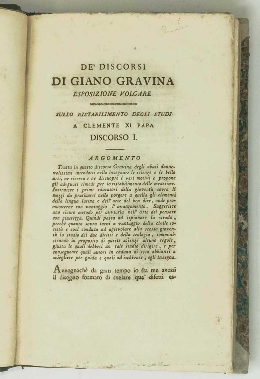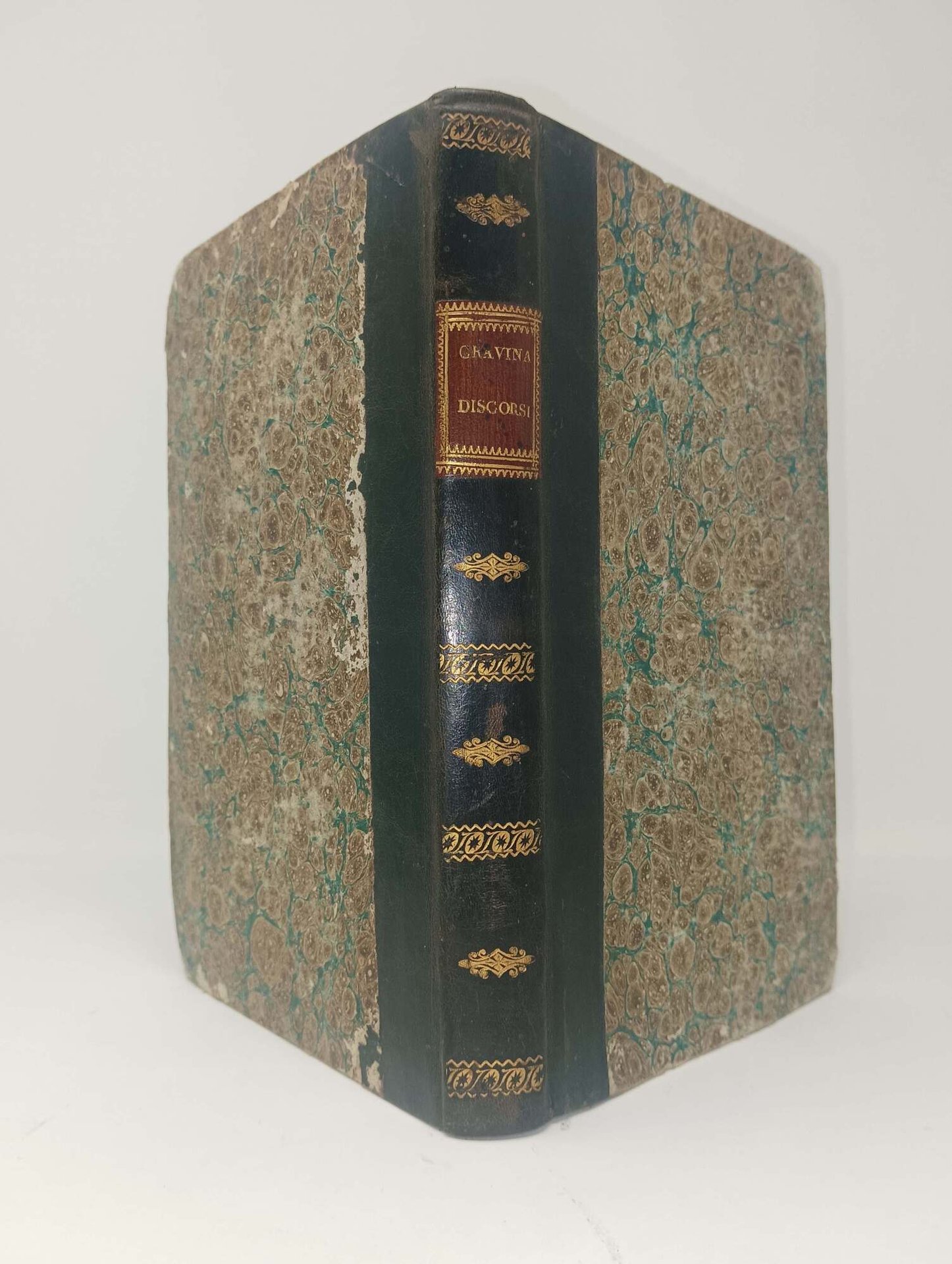>in-8 (mm 215x130), pp. (2), XX, (5), 221, (3), m. pelle verde, dorso con autore e titolo in oro entro tassello marrone e decori dorati. Raccolta di nove discorsi di Gravina, celebre giurista, letterato e co-fondatore dell'Accademia dell'Arcadia. Esemplare in carta grande vergellata con margini fino a 5 cm e filigrana. Segni del tempo agli angoli dei piatti.
