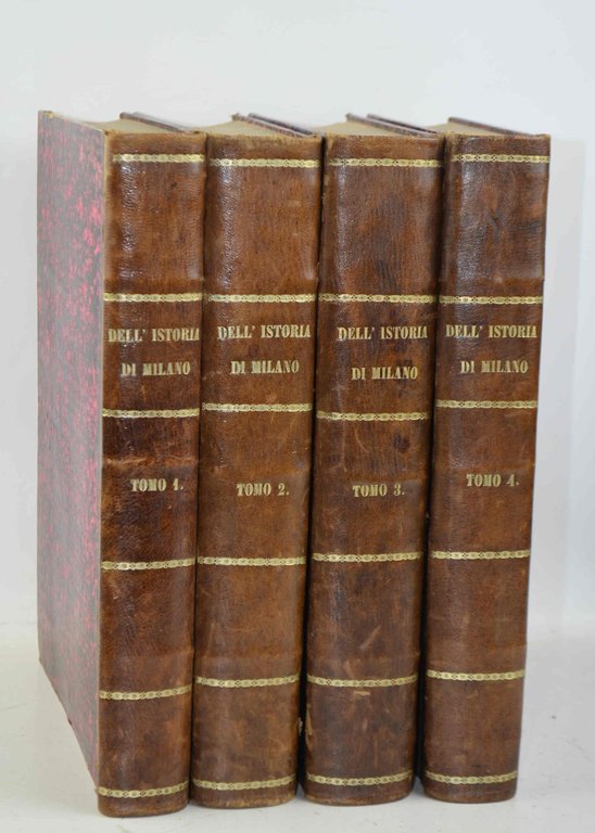 Quattro volumi di cm. 29, pp. xi (1) 428 (2); 534 (2); 594 (2); 528. Con molte incisioni nel testo e 25 tavole fuori testo fra cui due carte ripiegate (carta geografica dell'Alta Italia e pianta di Milano). Il tutto finemente inciso in rame. Solida ed elegante legatura coeva in mezza pelle, dorsi lisci con filetti e titoli in oro. Esemplare genuino, marginoso e ben conservato. Si tratta della prima edizione di questa storia milanese che prende in esame il periodo storico dalle origini al 1535.