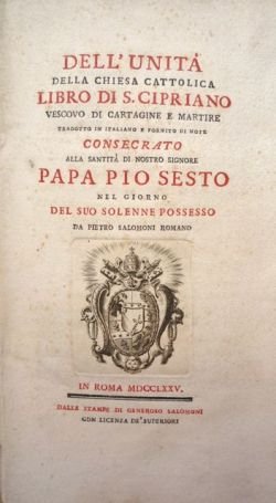 Dell'unità della Chiesa Cattolica. Libro di S. Cipriano [.] tradotto in italiano e fornito di note consecrato alla Santità di Nostro Signore Papa Pio Sesto nel giorno del suo solenne possesso da Piatro Salomoni Romano. | Libri antichi e moderni | Cyprianus Caecilius Thascius.