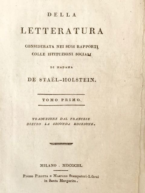 2 volumi in-8° (22,5), brossure mute coeve con etichetta di libraio al piatto; pp. XLVI 239, 240 [4] in ottimo stato, in barbe e particolarmente fresche. Prima importante traduzione italiana sulla seconda francese. La De Stael intraprende l’analisi comparata di molte letterature in rapporto alla società, superando lo schema settecentesco di Voltaire o di La Harpe. Ottimo esemplare.