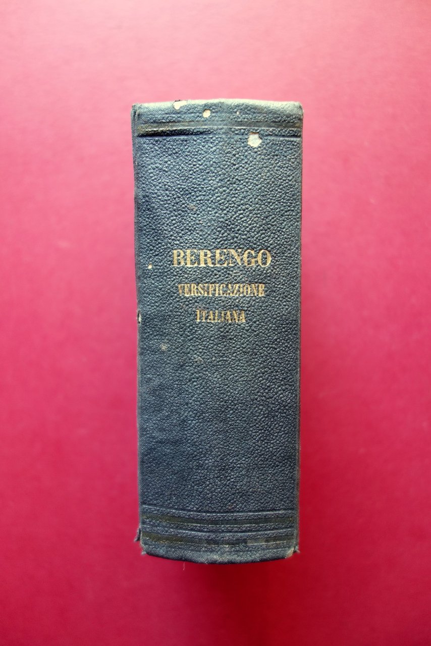 Giovanni Berengo, Della versificazione italiana trattato dell'Ab. Giovanni Berengo parte prima - seconda (trattato completo) Nel priv. Stabilimento Nazionale, Venezia 1854; cm 13,5x9; pp. XII-206 (parte prima); pp. 532 (parte seconda); legatura d'epoca in tutta tela con titolo impresso in oro al dorso. Opera completa in due parti rilegate in un unico volume. Condizioni di conservazione Esemplare in buone condizioni con tracce d'uso, coperta con poche piccole leggerissime macchiette e, al piatto post., qualche lieve traccia di vecchia umidità; angoli con minimi strappetti; dorso con poche minuscole mancanze. Interni buoni con alcune leggere bruniture. Opera completa in due parti rilegate in un unico volume. SETT4.L19969 N P