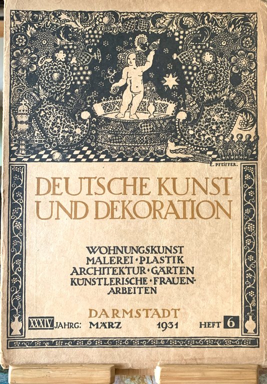 I ed. del periodico. XXXIV Jahrg: März 1931, Heft 6. Testo in tedesco. IV/(2)+357-424+(2)+(4)/brossura in cartoncino liscio écru con titoli ornati e illustrazioni in nero e ocra (primo piatto: cornice ornata e illustrazione in nero firmata E. Pfeiffer - altri piatti: informazioni editoriali e pubblicità illustrati in ocra). Con illustrazioni nel testo in b/n e con illustrazioni in b/n e a colori in tavole f.t.. Stato buono (usura della copertina ai margini, in particolare al dorso - pagine leggermente ingiallite e con qualche fioritura - inizio distacco del blocco delle pagine dal dorso della copertina - manca il frontespizio?). Inhalt: Der Maler Marc Chagall; von Albert Dreyfus - Auseinandersetzung mit George Grosz; von Dr. Herbert Hofmann (Wunsch an die Maler; Wilh. Michel.) - Zu den Bildern von Robert Eigenberger; von Georg Saiko - Gino Severin-Paris; von Dr. Fritz Neugass - Ausstellung von Werken japanischer Maler in der Akademie der Künste, Berlin; H. Friedeberger. (Stilleben von Dufresne (Seite 380); Dr. Aurelie Gottlieb. - Neue Terrakotten von Vally Wieselthier; Arch. Dr. Alfr. Wenzel - Haus am Kräherwald; Paul Griesser - Die not der Künstler. Ein Brief der preussischen Kultusministers; Die. Schr. - Neue Wagen der österreichischen Bundesbahn. Nach Entwürfen von Prof. Josef Hoffmann-Wien; W. Born. - Kunst und Zeitgenosse; O. S. - Inhalts-Verzeichnis. Band 67, Oktober-März 1931 (Text-Beiträge - Abbildungen (Sachlich Zusammengestellt) - Sepiation- und Farbdrucke - Namen Verzeichnis.).