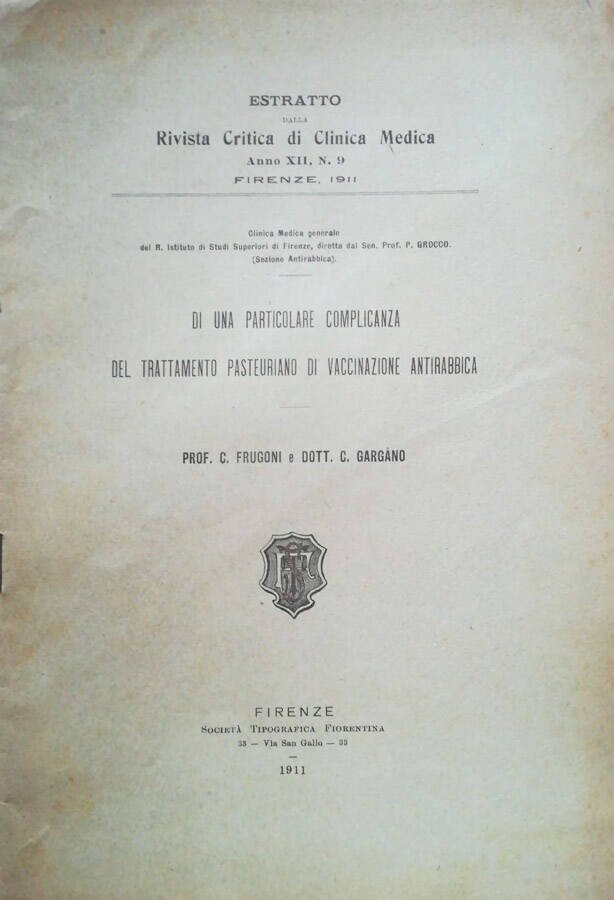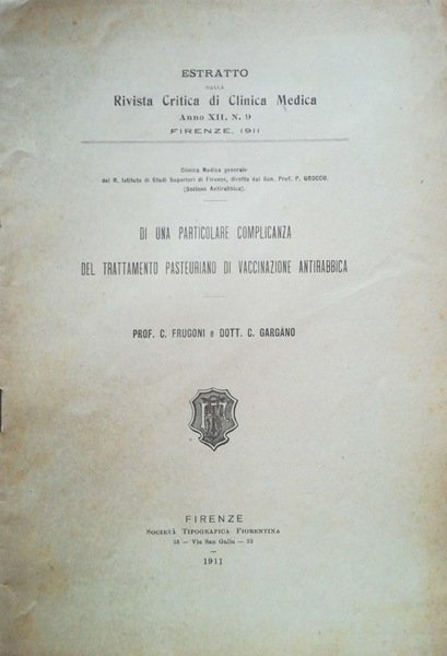 Di una particolare complicanza del trattamento pasteuriano di vaccinazione antirabbica | Libri antichi e moderni | Prof. C. Frugoni E Dott. C. Gargano