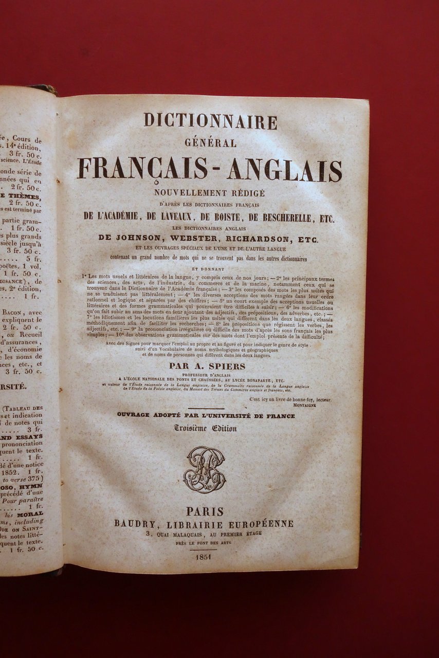 Dictionnaire General Francais-Anglais A. Spiers Baudry Paris 1851