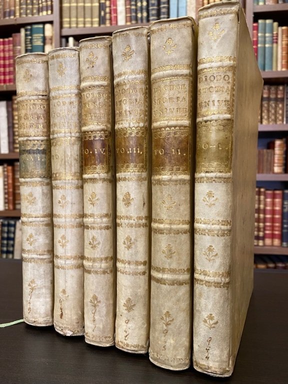 <span style="font-style: normal;">6 volumi in-4° (cm. 24,5), legature coeve in piena pergamena rigida con titolo e fregi in oro ai dorsi (scoloritura al dorso del solo tomo quinto), tagli spruzzati; </span><i>Ex libris</i> di Camille Aboussan ai contropiatti e ai risguardi; leggero alone al margine di un paio di tomi. Interessante volgarizzamento. «Plinio dice che questo Diodoro è il primo fra i Greci che si è astenuto di dire delle bagatelle» [vol.I, p. VI]. Cfr. Graesse II, 396. Buon esemplare. (SB5)