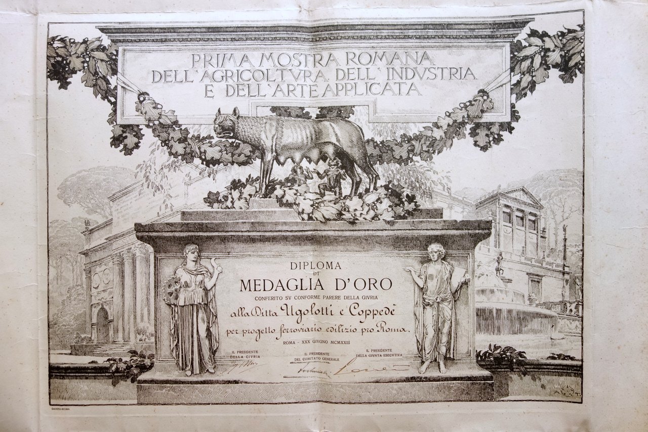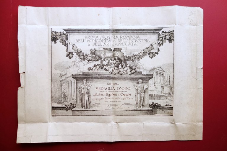 Diploma, Prima Mostra Romana dell'Agricoltura, dell'Industria e dell'Arte Applicata Diploma di Medaglia d'Oro conferito su conforme parere della giuria alla ditta Ugolotti e Coppedè [.] Roma, 30 giugno 1923 Danesi, Roma 1923; diploma a stampa su carta, con bella grafica xilografica; sezioni bianche compilate manualmente; alla parte inf. timbretto in rilievo e firme di convalida. Grafica firmata A. Terzi. Cm 55x75. Condizioni di conservazione Esemplare in buone condizioni con pieghe di conservazione, qualche marginale strappetto, piccole leggere bruniture. Per maggiori dettagli vedi foto. Bella grafica xilografica, firmata A. Terzi. Conferito per progetto ferroviario - edilizio. EXTRA.0279 N