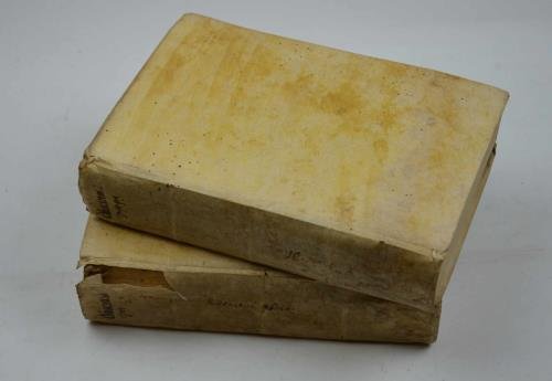 Due volumi di cm. 22,5, pp. 2.000 ca. complessive. Frontespizi in rosso e nero con grande marchio tipografico centrale ed un'incisione a piena pagina. Bella legatura coeva in piena pergamena floscia con titoli ms. ai dorsi. Qualche tarletto marginale e pochi segni d'uso, esemplare genuino e fresco, in ottimo stato di conservazione.