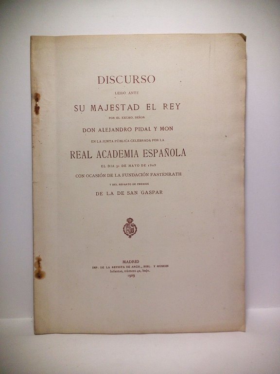 Discurso leído ante su Magestad el Rey por el Excmo. Señor D. Alejandro Pidal y Mon, en la Junta Pública celebrada por la Real Academia Española el día 31 de Mayo de 1909 CON OCASION DE LA FUNDACION FASTENRATH Y DEL REPARTO DE PREMIOS DE LA DE SAN GASPAR | Libri antichi e moderni | Pidal Y Mon, Alejandro
