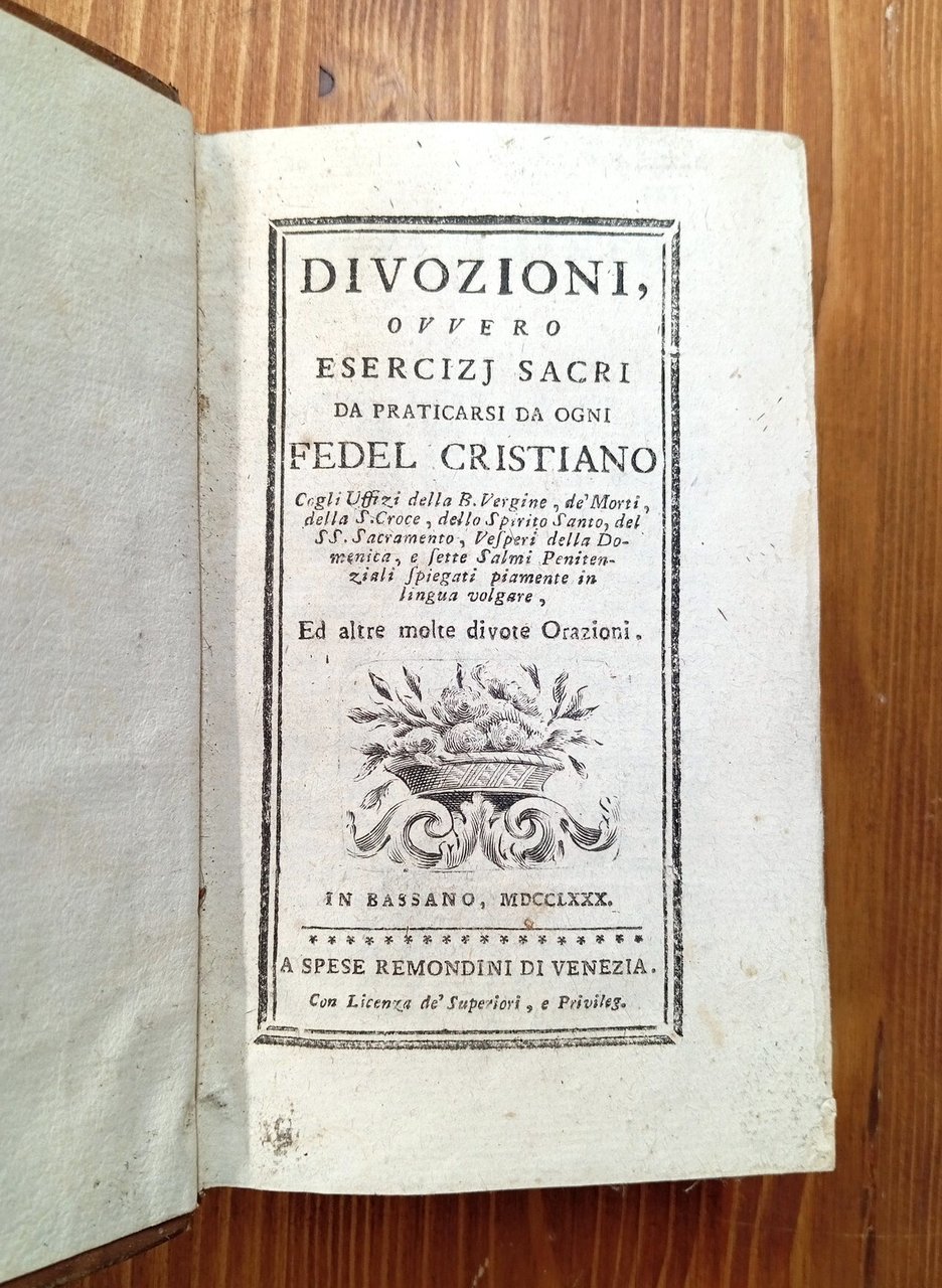 Divozioni, ovvero Esercizj sacri da praticarsi da ogni fedel cristiano; cogli uffizi della B. Vergine, de' morti, della S. Croce , dello Spirito Santo, del SS. Sacramento, Vesperi della Domenica, e Sette Salmi Penitenziali spiegati piamente in lingua volgare ed altre molte divote orazioni