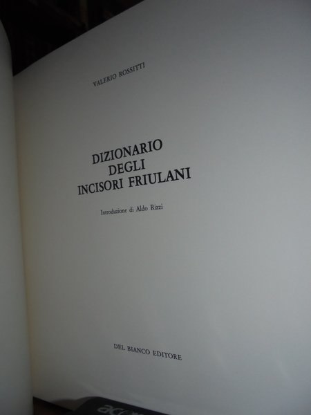 Valerio, Rossitti. Bologna, Del Bianco Editore, 1981. Dizionario degli incisori friulani. In-8° quadrato, cartoncino edit. con grandi bandelle. 115 pp. con numerose ill. in nero n.t. Esemplare in stato di nuovo. Neg. arte mob. 11