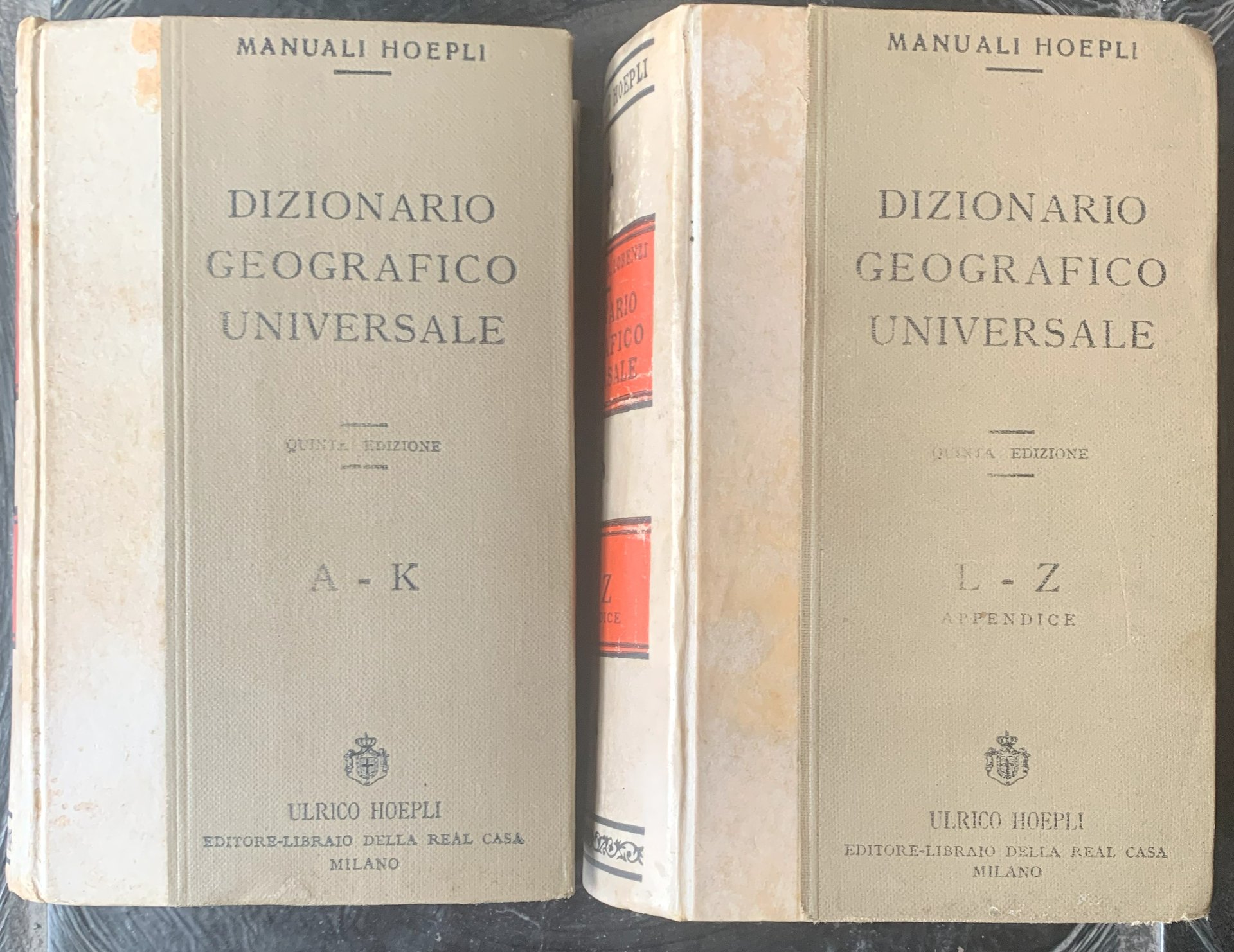 V ed. coi dati del Dopoguerra interamente rifatta e notevolmente accresciuta dal Prof. - Prof./Dott. Arrigo Lorenzi, Ordinario nella Regia Università di Padova, Membro effettivo del Reale Istituto Veneto di Scienze Lettere e Arti. Collezione "Manuali Hoepli". Il dizionario è in due volumi in-16 rilegati in mezza pelle con titoli in nero al primo piatto e con titoli in nero e ornati in rosso e in nero al dorso (all'ultimo piatto è impresso il marchip dell'Editore-Libraio). Volume Primo (A-K, 1929-30, pp. I-XII+1-998+(2)): Prefazione alla Quinta edizione; di Arrigo Lorenzi (Padova, giugno 1929) - Tavola delle abbreviazioni e avvertenze per l'uso del Dizionario - Dizionario (A-K) Volume Secondo (L-Z e Appendice, 1932, pp. (2)+999-2192)): Dizionario (L-Z) - Appendice (Rettificazioni ed aggiunte)-. Stato complessivo dei due volumi buono (stato d'uso delle copertine che presentano margini lievemente consunti e titoli in parte consumati - fioriture e segni da umidità nei risguardi - pagine leggermente ingiallite, in particolare ai margini - fac-simile di firma di possesso mediante timbro blu)