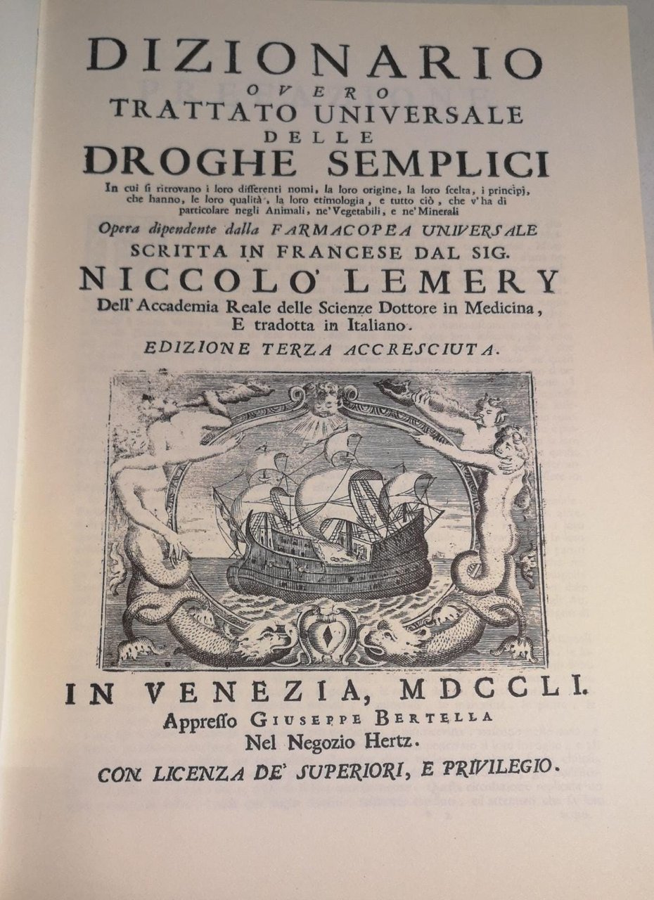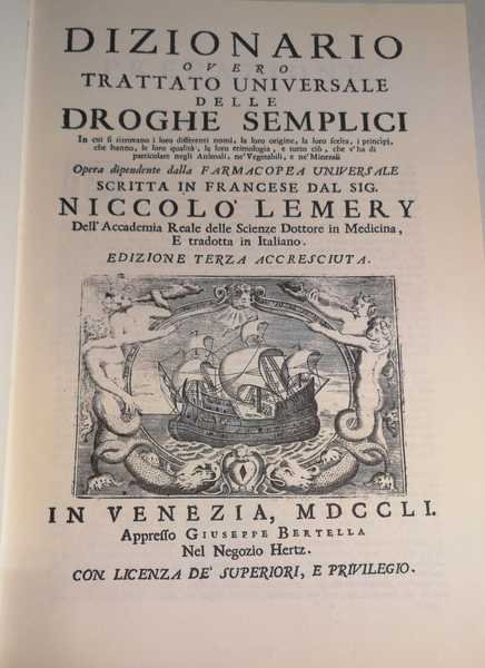 DIZIONARIO, OVERO TRATTATO UNIVERSALE DELLE DROGHE SEMPLICI ... : OPERA DIPENDENTE DALLA FARMACOPEA UNIVERSALE. | Libri antichi e moderni | LEMERY Nicolas