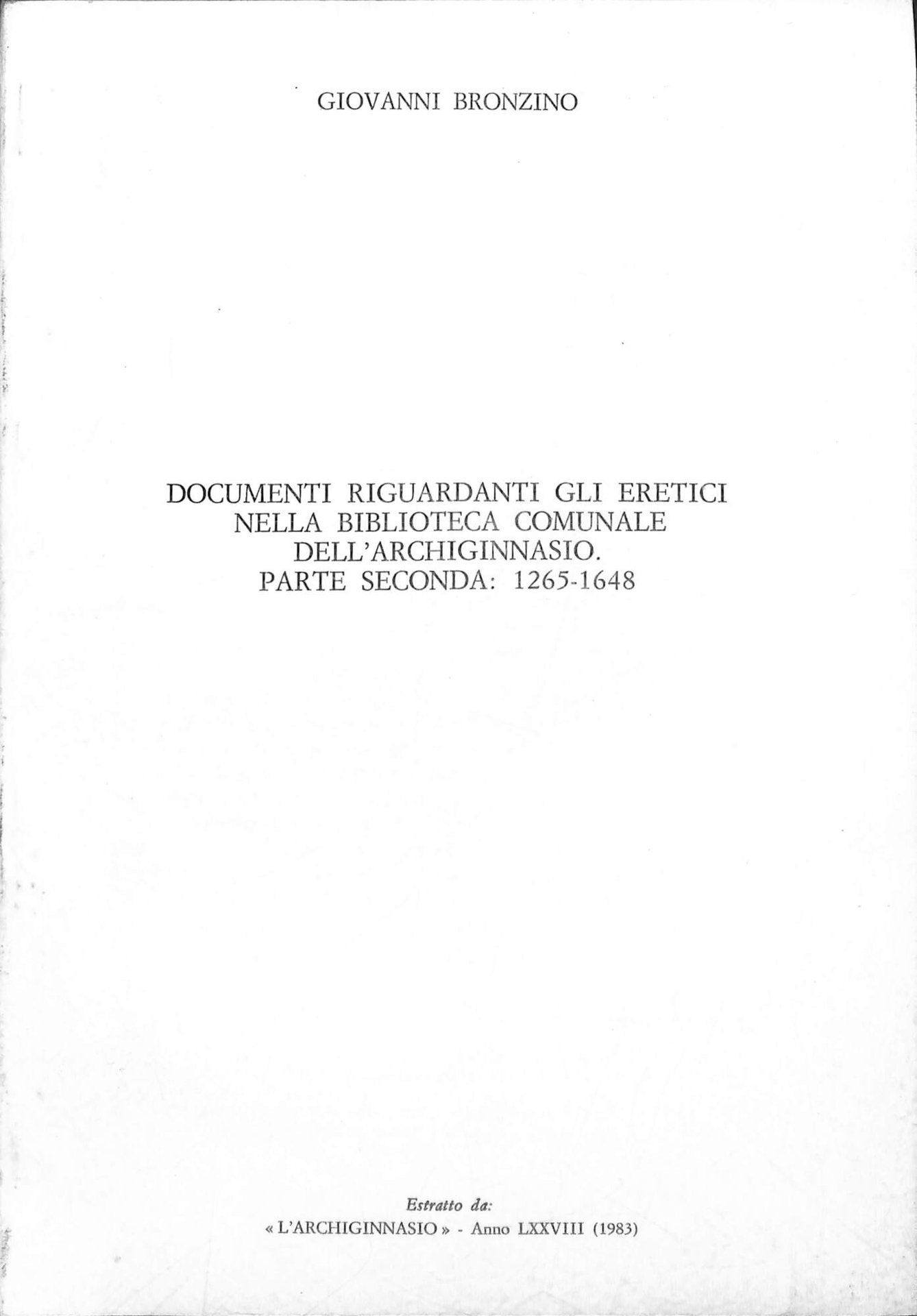 Documenti riguardanti gli eretici nella Biblioteca comunale dell'Archiginnasio : parte seconda: 1265-1648. Estratto da L'Archiginnasio, pp. 285-401 ; 24 cm. 200 LOC Ottimo (Fine)