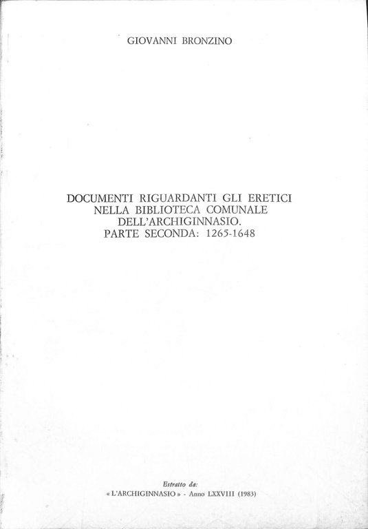 Documenti riguardanti gli eretici nella Biblioteca comunale dell'Archiginnasio : parte seconda: 1265-1648 | Libri antichi e moderni | Bronzino, Giovanni